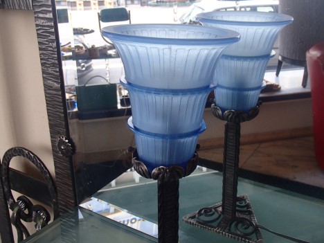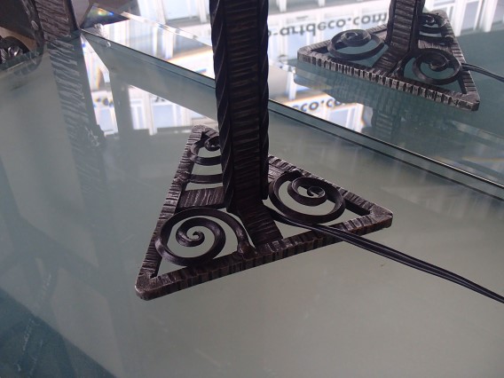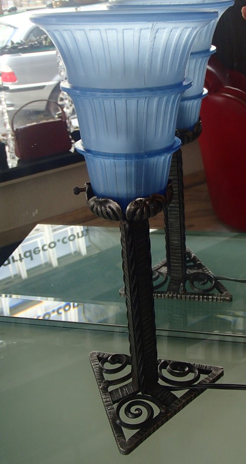 Tischlampe mit Schmiedeisenfuss und blauem Reliefglasschirm