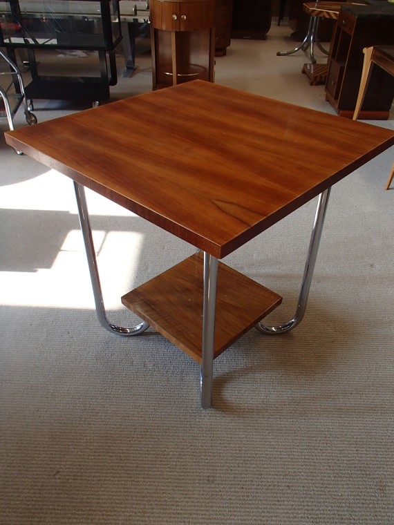 Salontisch Nussbaum mit Chromstahlbeinen.