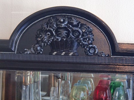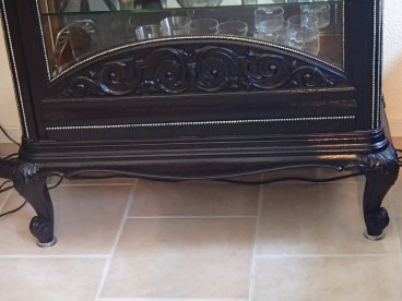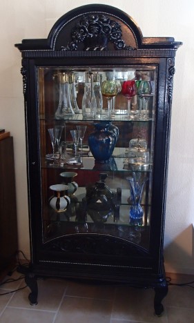 Vitrine mit Orignialmercurerückspiegel Eiche mit Silberverziehrungen auf geschwungenen Füssen
