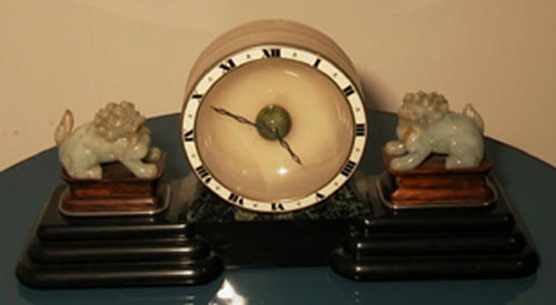 Buffetuhr "Gübelin" diverse Marmor Jadehunde auf Mahagonieholzsockel, emailliertes Zifferblatt