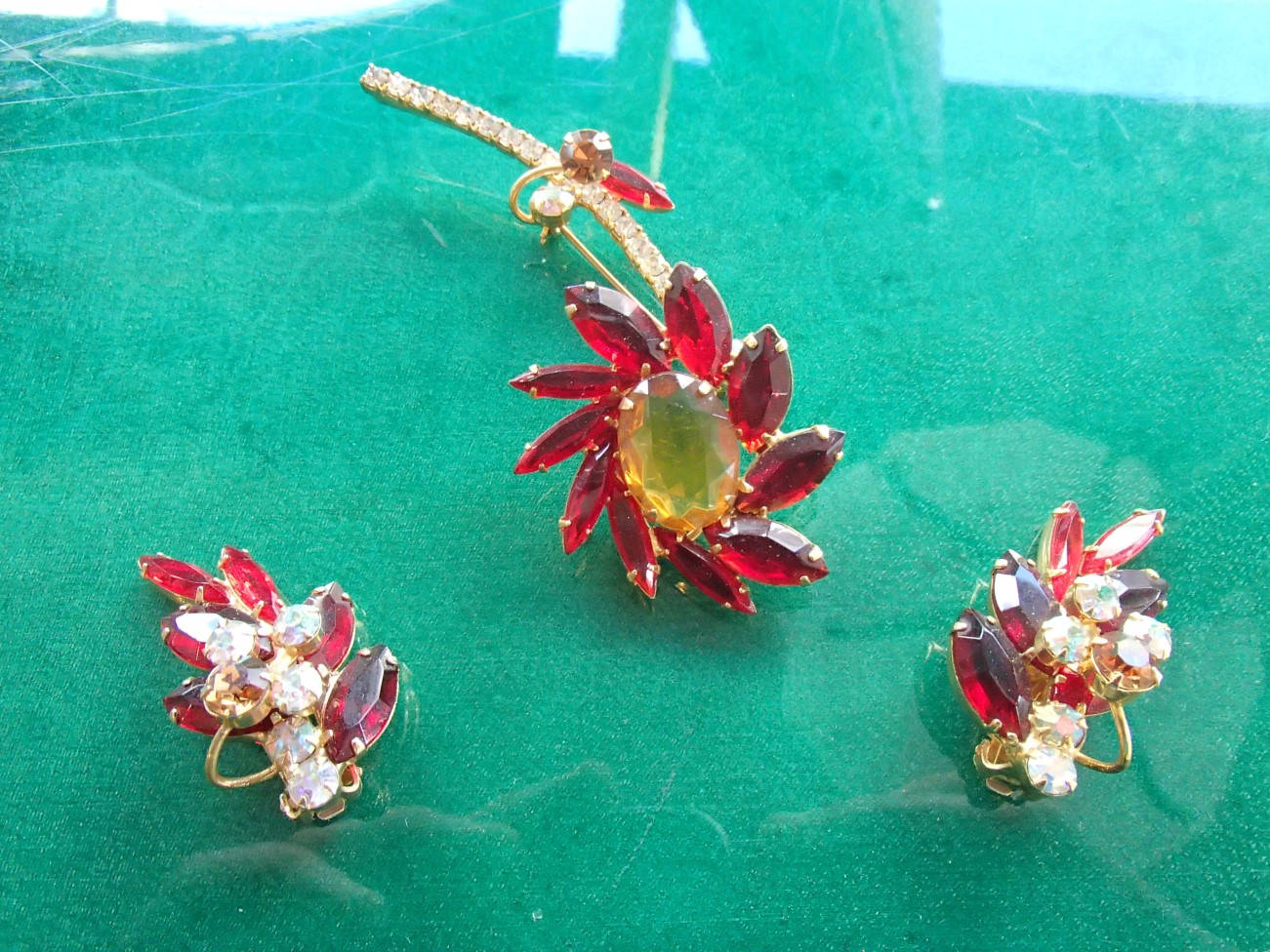 Brosche und Clips mit farbigen geschliffenen Glassteinen